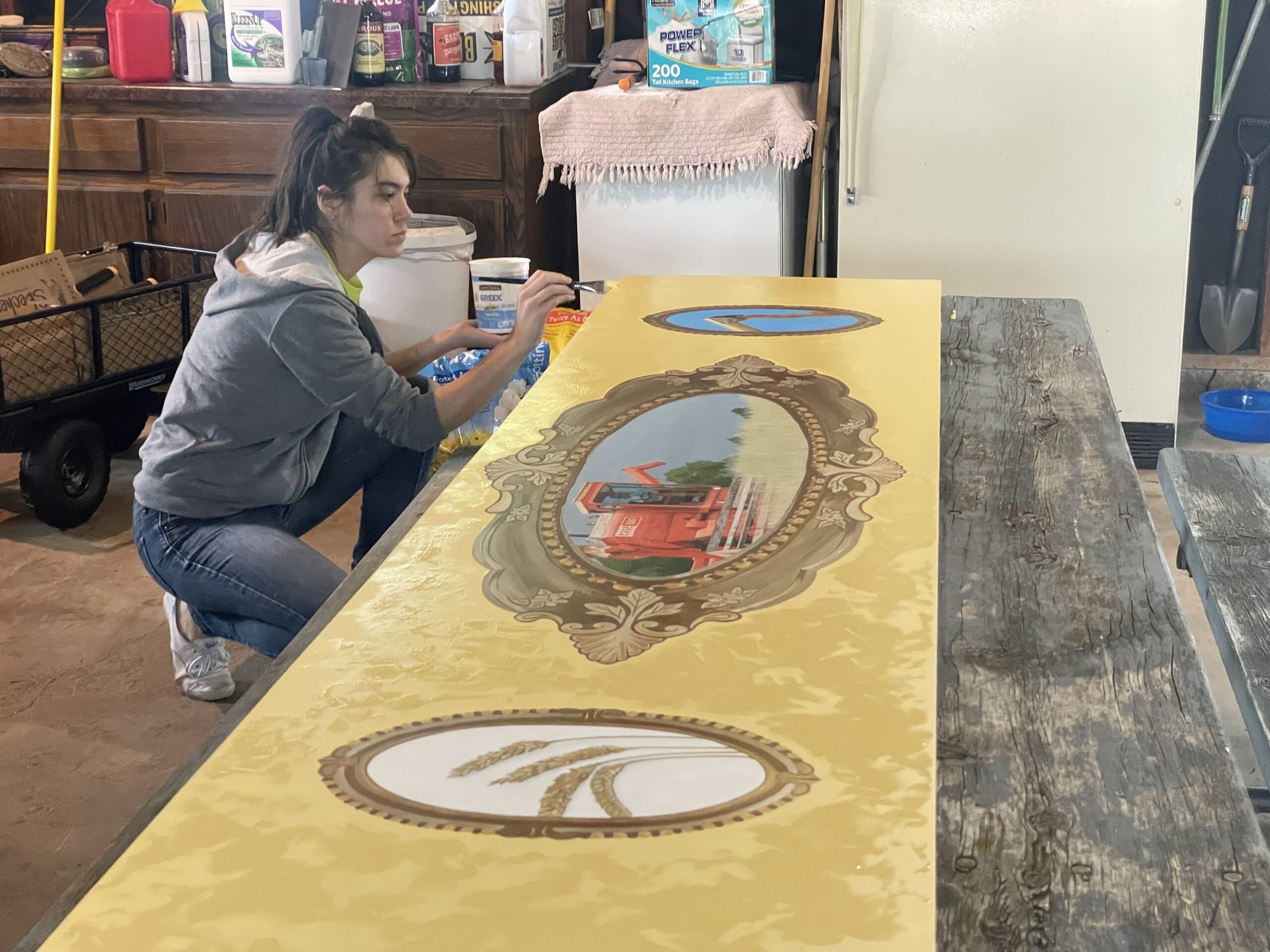 With the disrepair of much of the carousel, this allowed the club to make it our own. Wayne Moravec and Andy Moravec spent much of their winter building and reconstructing much of the woodwork. Allowing us to incorporate a theme of tractor brands into the design. The rounding boards were also re-built and then hand-painted by a local artist, Laura Schley. These murals that are on the boards today all feature a scene from our show, and are sponsored by a club member.